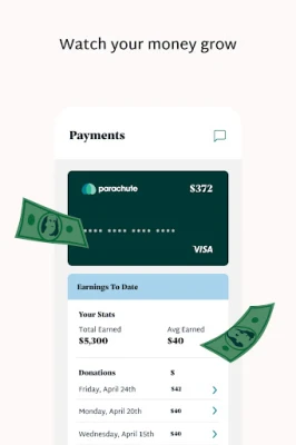 * Instant Payment: your payment gets automatically processed to your Parachute card every time you donate. The card has ATM access and can be used as a debit card.